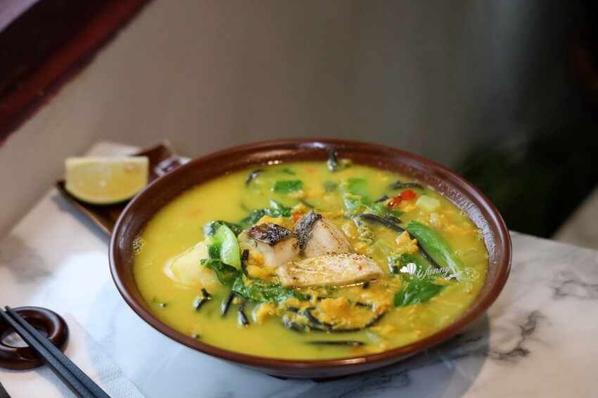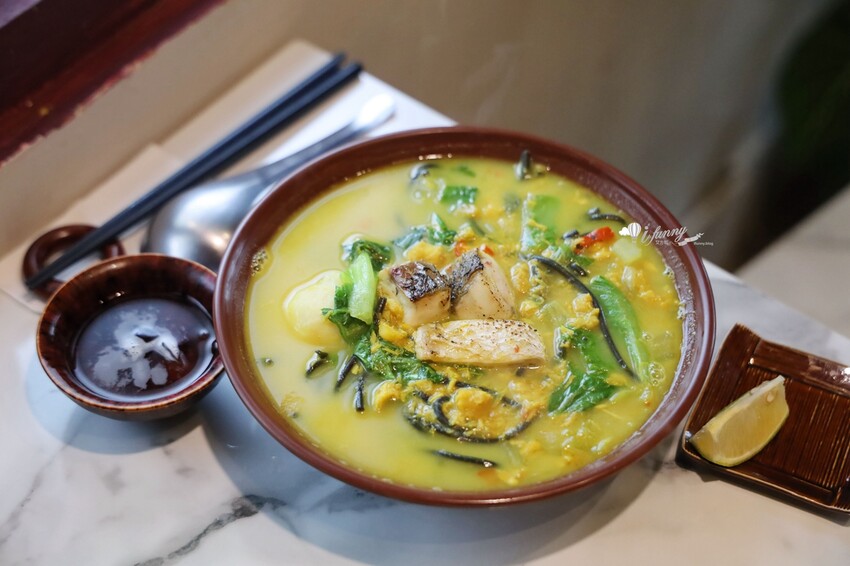 這碗麵的湯底呈現黃色,是採魚骨熬煮四小時而成,裡頭是滿滿的碎魚肉,服務人員告訴我們整碗麵,可是超過一整條的魚肉,性價比相當高。