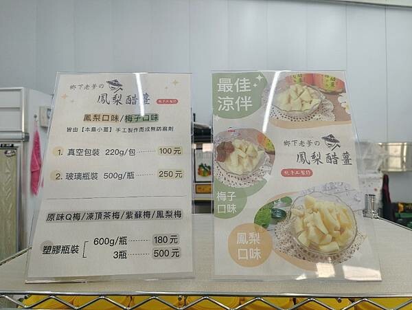 鄉下老爹の鳳梨醋薑的價格只分成真空包裝(220g/包)100元及玻璃瓶裝(500g/瓶)250元,而口味相當單純的只有鳳梨口味以及梅子口味,喜歡吃嫩薑的朋友快來試試吧!!