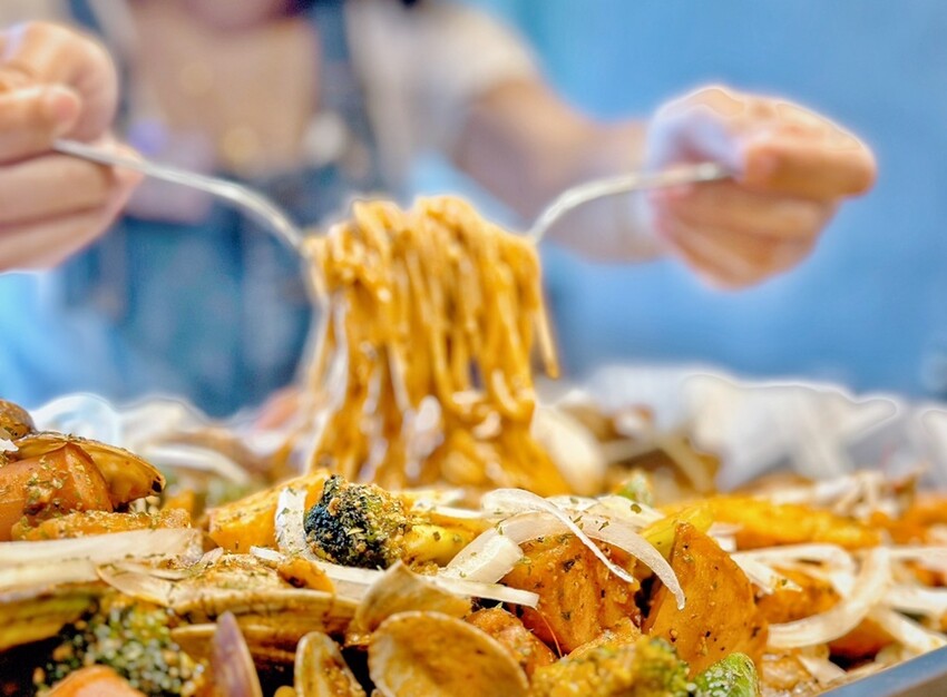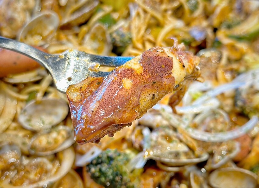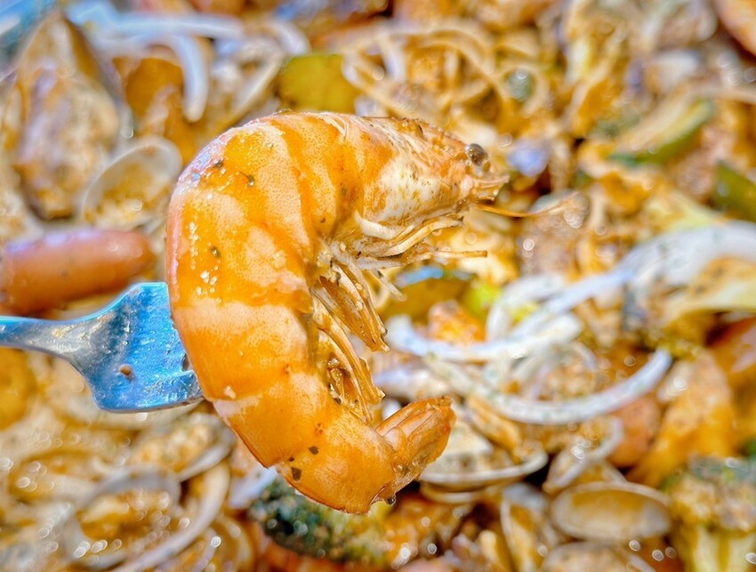 四人份海鮮內有鮮蝦、淡菜、小卷、海瓜子(蛤蜊)、花椰菜、玉米筍、馬鈴薯、小黃瓜、德式香腸、洋蔥、義大利麵等,三五好友手抓吃這一大盤真的很過癮。