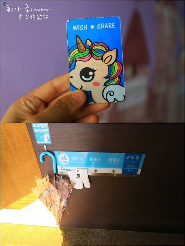 晚上入住的是「獨角獸主題房型-城堡創意四人套房」,從房卡、雨傘、