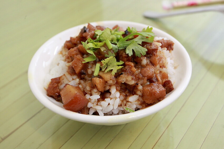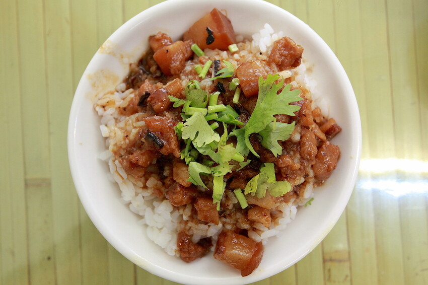 這肉燥飯使用帶皮肥肉居多下去滷製而成,表面鋪上香菜就是一碗香噴噴肉燥飯。