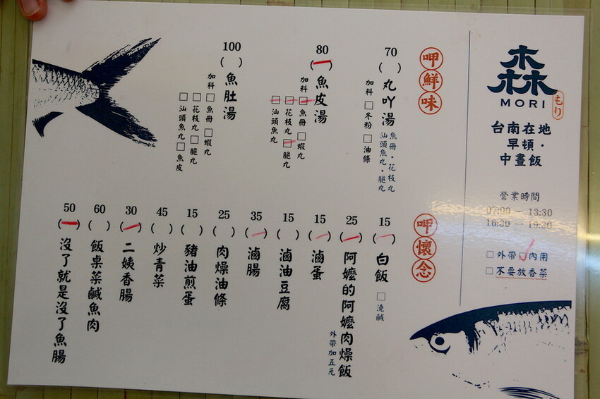 台南知名老字號「老李早餐店」已遷移公園路上,原址賣起台南特色小吃虱目魚相關料理,從外觀看起來很日式店名叫「森(mori )魚丸湯、肉燥飯」,小高記得剛開幕時就列入品嚐口袋名單,今天就利用午餐時間專程前來用餐,走入店內看菜單才發現與直覺菜色有差別,原本認為是賣鮮魚湯、肉燥飯、鮭魚鬆飯..等相關美食,原來是賣台南在地特色虱目魚料理小吃,品嚐完覺得很美味定價合理範圍內,值得樂天小高推薦給您品嚐。