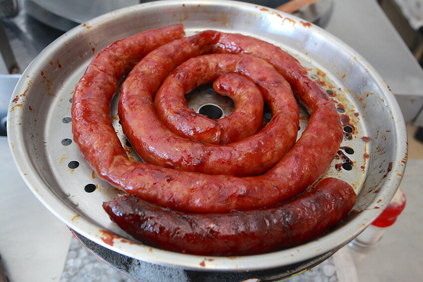 檯面上這香腸放在這樣圓形煎鍋是台南特色。