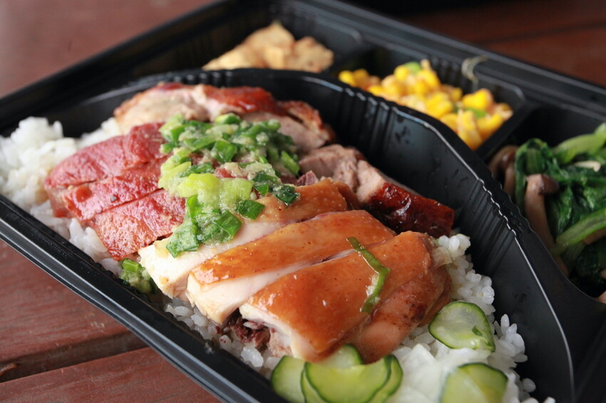 這是三寶飯有叉燒、油雞及燒鴨等三樣食材,表面有淋上油蔥醬來提味。