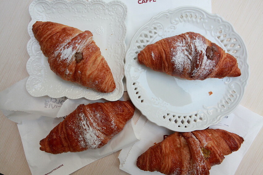 櫃台玻璃櫃裡有各口味可頌跟義式甜點, 裡面可頌有供應原味、榛果巧克力、卡士達、開心果醬及果醬等5種口味。
