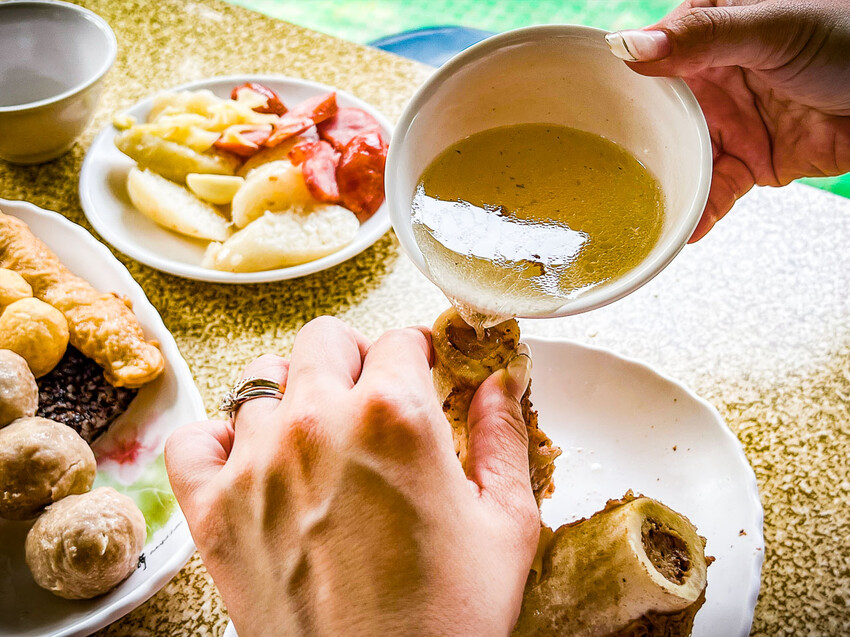 吸大骨也需要高湯,把湯直接灌進大骨裡,再用吸管吹戳一戳讓骨髓跟高湯融合就可以吸了,個人是覺得骨髓吸起來有點油….但高湯的味道倒是蠻不錯的