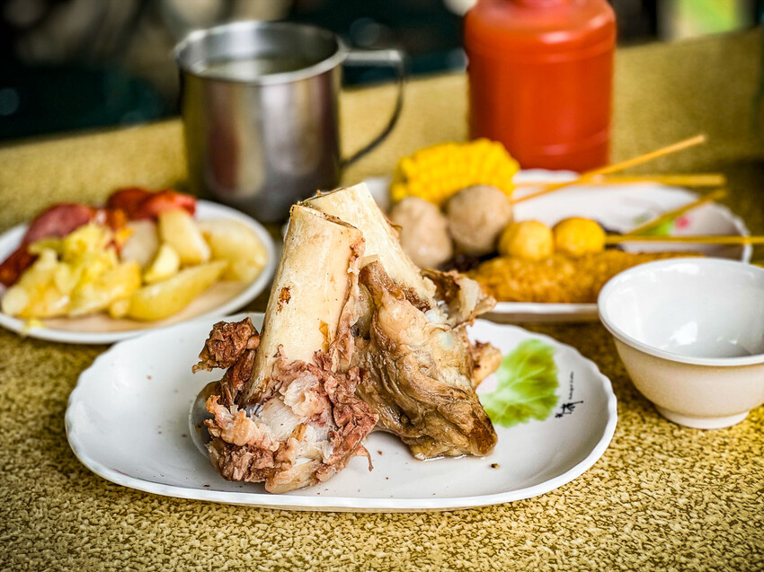 不管內用外帶都需要排隊,先排隊點完餐再去找位置坐,點餐就是在三輪車攤車處,排到你就可以點餐,鍋裡的黑輪都是自己夾到盤子裡,招牌大骨直接跟阿姨點就可以了,一份是兩根,點了才會從湯鍋裡撈出來