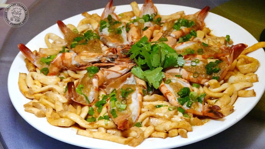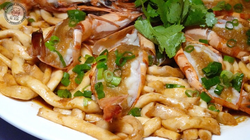 新鮮的大蝦鋪上蒜蓉和粿條一起去蒸,