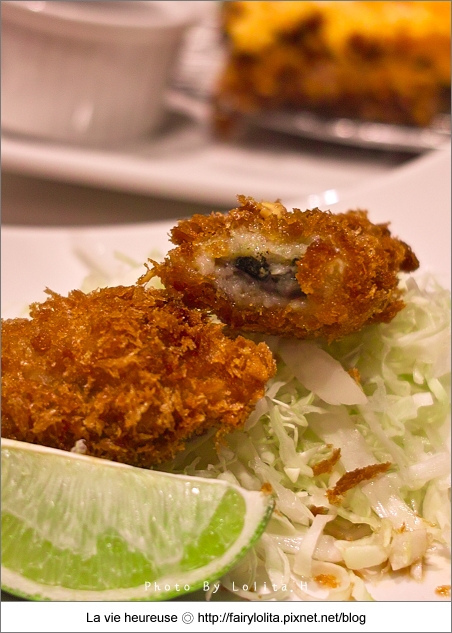 炸牡蠣只有三粒,而且個頭還好小呦!當下還真有些希微的感覺 >< 還好麵衣炸得又酥又脆,牡蠣也還算新鮮,不然一份要價230大洋,如果再難吃的話就當真很囧了!XD