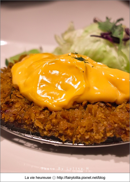 原以為它是像平常我們吃到的炸豬排一樣,起司藏在肉片中,再裏麵皮下去油炸,結果起士醬竟是直接淋在豬排上頭,這招可真是夠特別了!澄黃的起士佐醬很誘人,加上不斷飄來的香味兒,直叫人食慾大開呢!定食中包含主餐,還有白飯、湯品及沙拉~