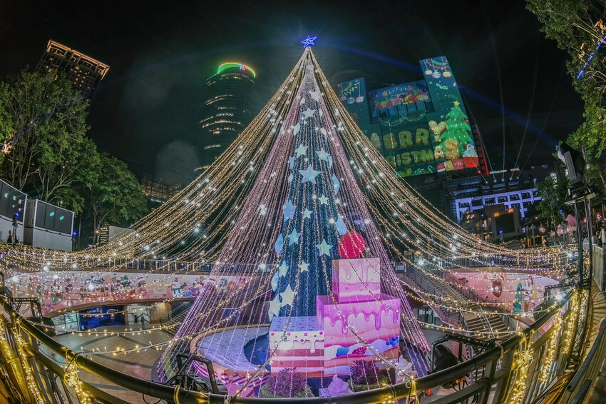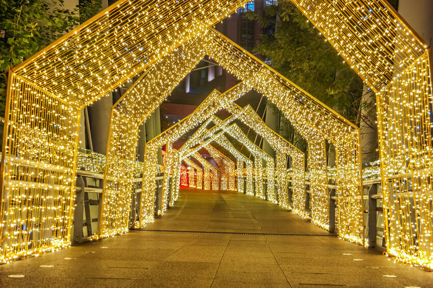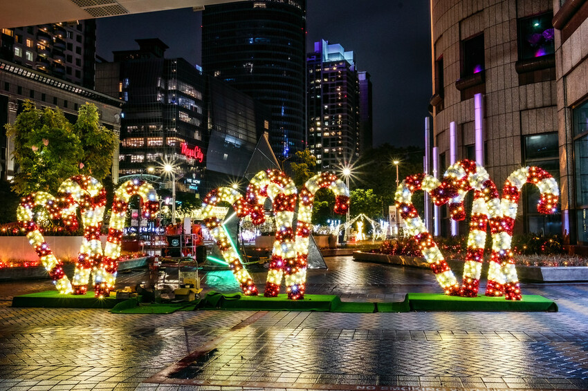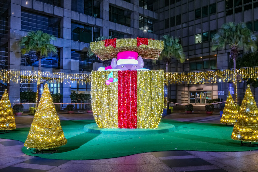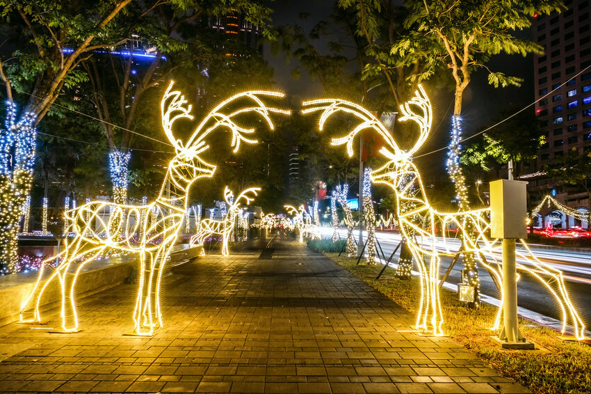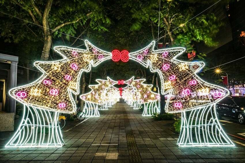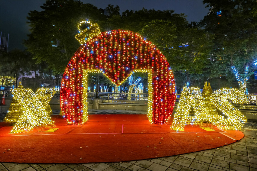 以璀璨耶誕節慶元素設計,使用大型打卡美拍燈光裝置物,結合街道燈光
