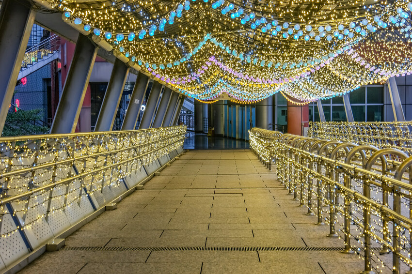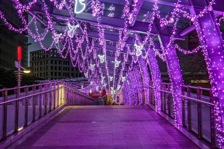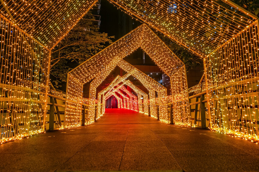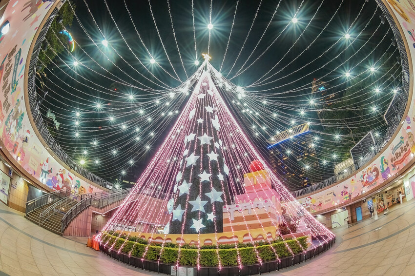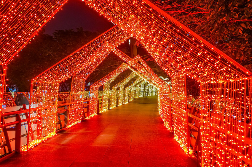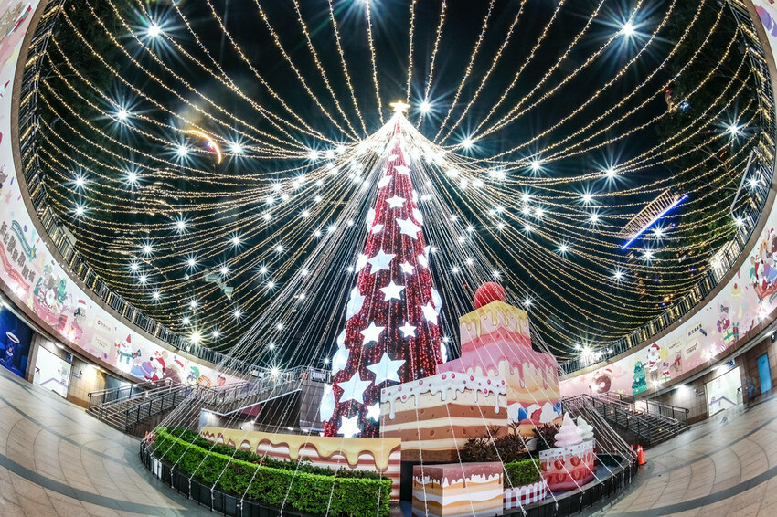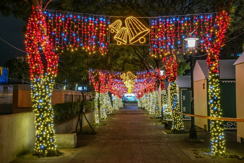 以璀璨耶誕節慶元素設計,使用大型打卡美拍燈光裝置物,結合街道燈光