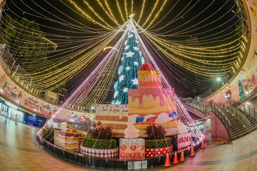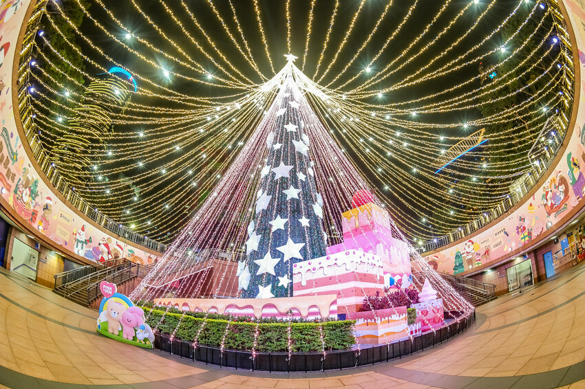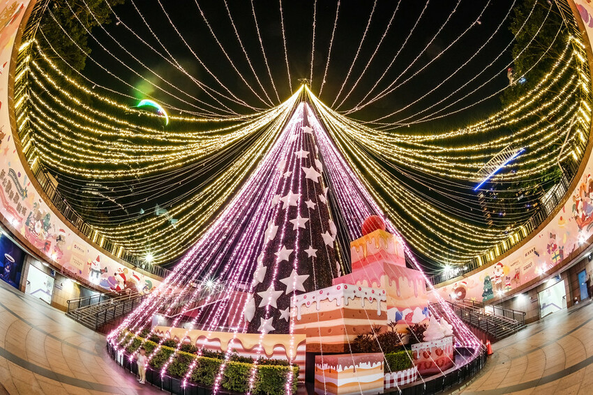 蛋糕大型耶誕樹裝置藝術作品,結合了音樂、燈光秀及雪花紛飛效果