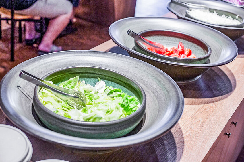 生菜沙拉區,每一樣看起來都很新鮮,蔬菜都有充分瀝水口感清脆,水果區也很澎湃,各種現切水果隨你吃