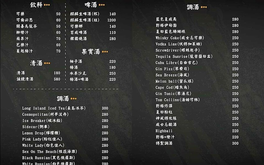 和以往在其他酒吧喝的長島冰茶不太一樣,這裡的竟然是透明白色的,調酒師以秘密配方作為基酒,風味酸甜,和串燒很搭,要是有想喝特別的調酒也可以詢問調酒師,店家也有提供特調。