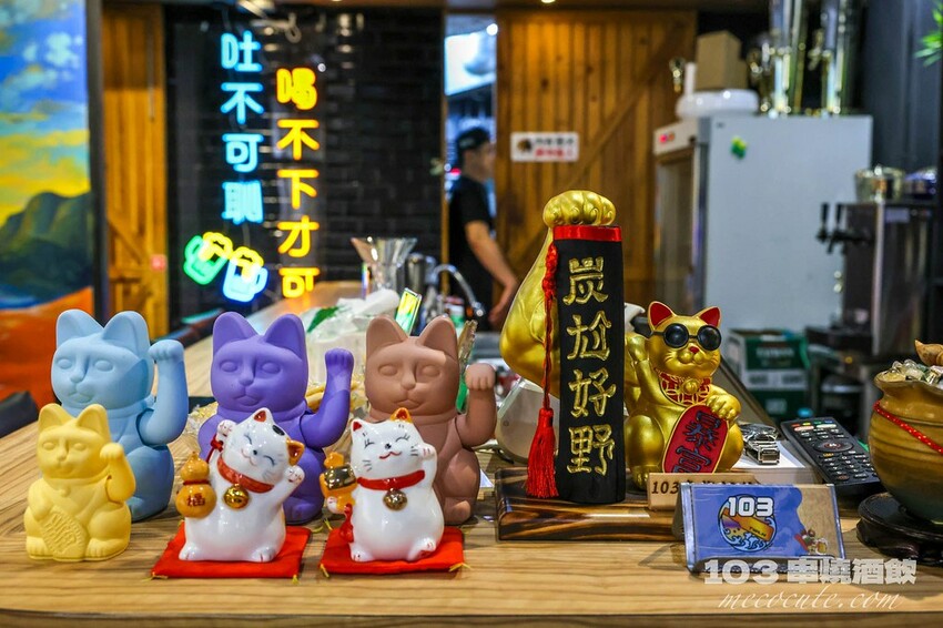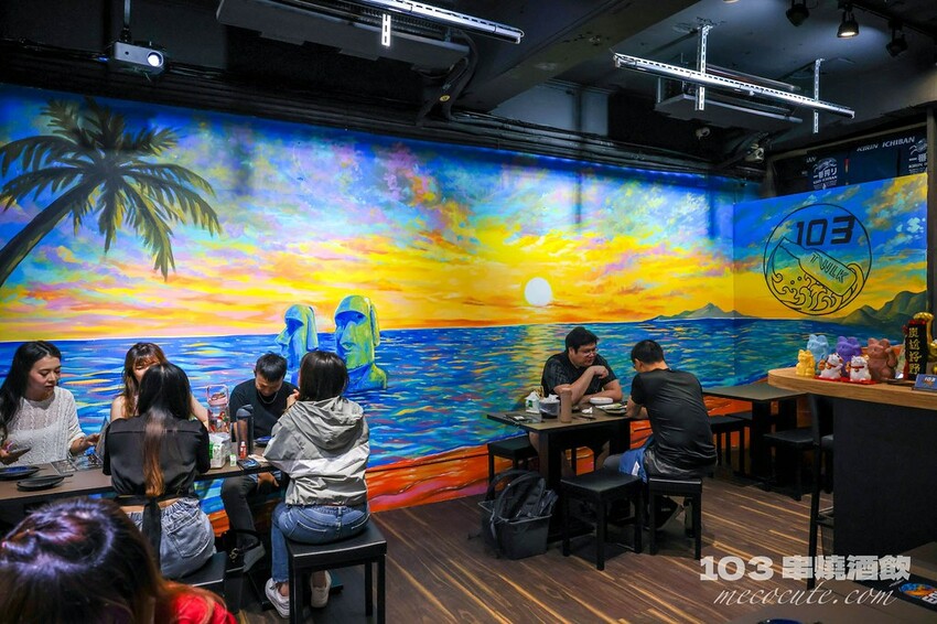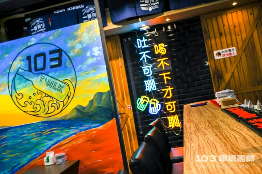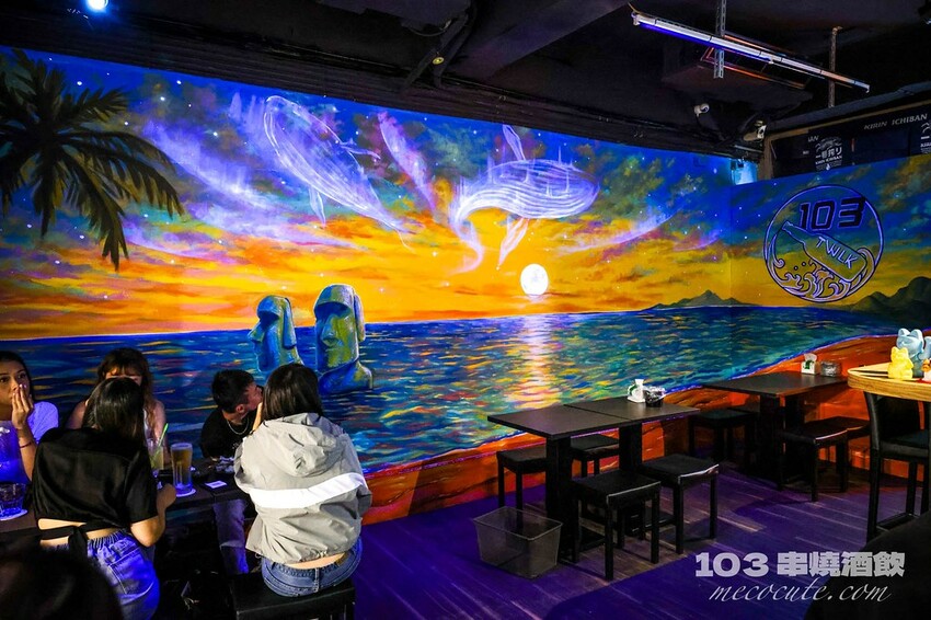很像來到國外的居酒屋,牆面彩繪吸睛,最特別的是,晚上九點後燈光會調整成像酒吧的氛圍,牆面還會變色,很有意思。