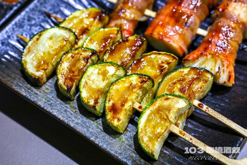 切成厚片的櫛瓜涮上店家自製醬汁,鹹香滋味,烤得酥脆又多汁,真的很好吃!