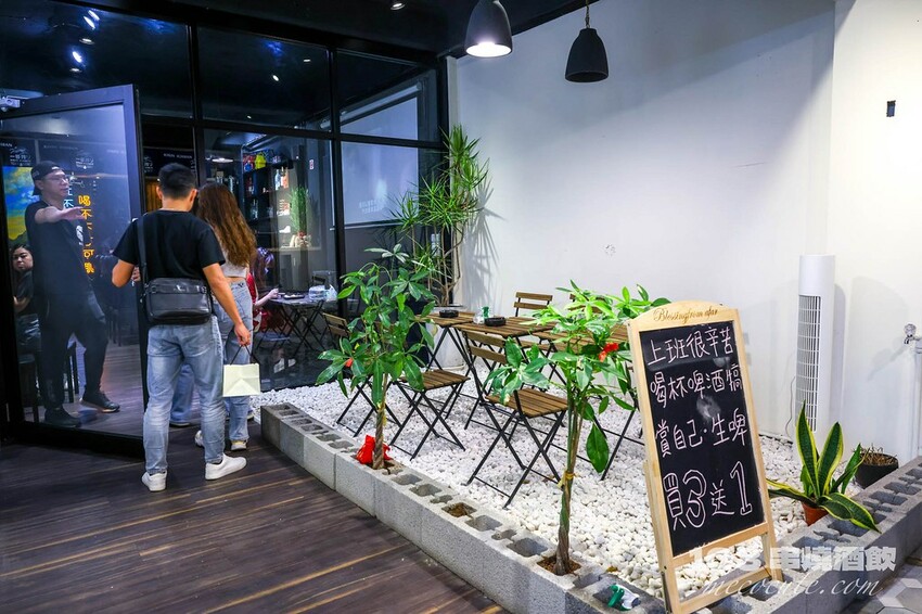 戶外有三張座位,擺設有點沙灘風,晚上約三五好友來這小酌還有優惠,板子寫著上班很辛苦,喝杯啤酒犒賞自己,生啤買3送1。