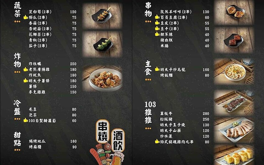 新開幕的串燒居酒屋「103 串燒、酒飲」地點位在台北中山區,菜單提供炸物、蔬菜、串燒、烤飯糰和明太子炒烏龍等,營業時間至凌晨~台北深夜食堂推薦。