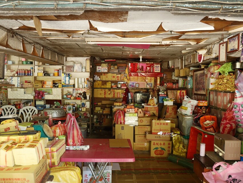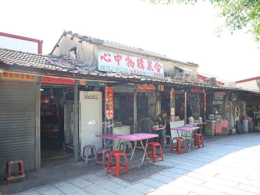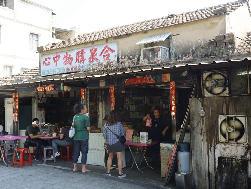 合泉購物中心同樣是舊時由右而左的排列中文,販售著日用百貨、五金建材及文具食品等,然後門口擺上幾張桌椅供客人坐下來用餐。