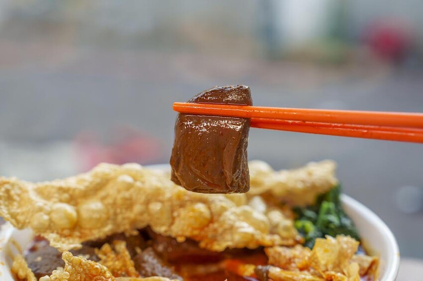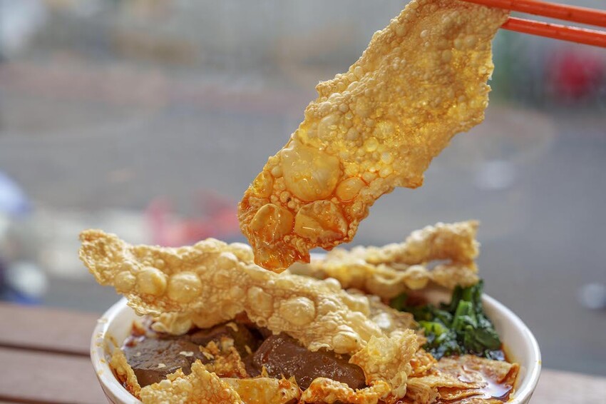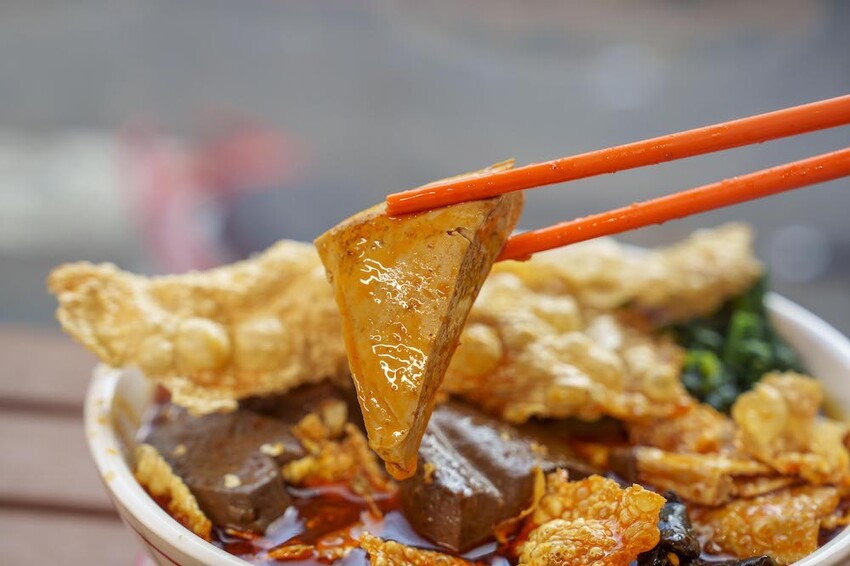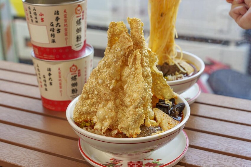 內用的部分我們今天吃的是:小匠鴨血螺螄粉、麻辣臭臭螺螄粉。修但幾壘,這個疊高高的炸豆皮是不是太浮誇惹,而且仔細一看,份量不手軟捏,給了好幾片~聽店家說是他們自製,吃起來口感很酥脆,泡進去螺螄粉湯裡也很不錯。