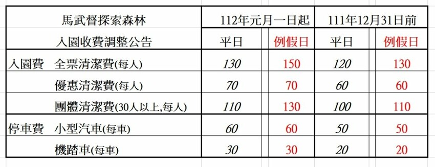 入園門票從111年1月開始調漲,有分平日及例假日價格,假日全票是是150元,3歲以上未滿12歲的兒童是70元。