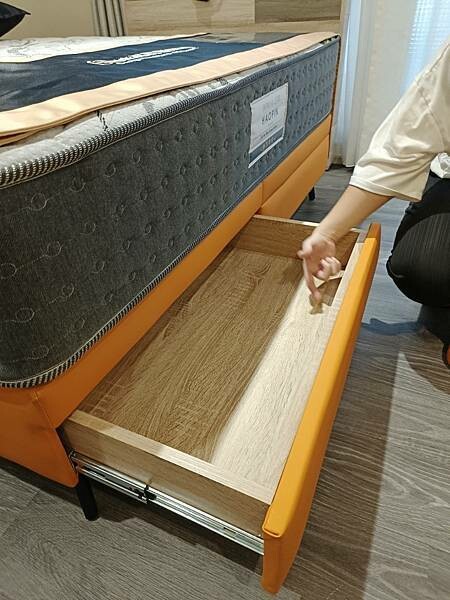 而床底内崁抽屜式,採用隱藏式滑軌五金,收納空間再加大。