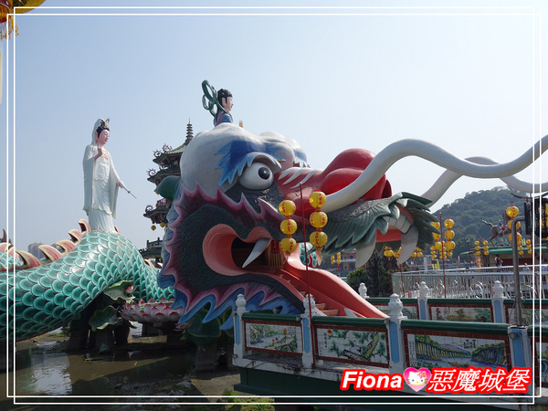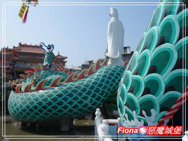 位在「春秋閣」前端有一尊騎龍觀音,由來有一傳說:觀音菩薩曾騎龍在雲端現身,指示信徒要依其現身之形態建造聖像在春閣與秋閣之間,於是有現今的騎龍觀音聖像~~
