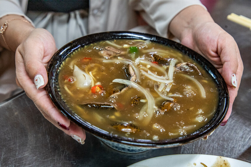 錦魯鱔魚羹麵,錦魯鱔魚羹麵真的是在南部才常見,然後阿吉鱔魚麵竟然不是用盤子裝,一般都是炒好之後淋上錦魯,但這邊直接變成一大碗羹湯,然後羹湯的香氣很足夠,酸甜味不會太重,且有一種特別的爆香味道,跟麵體搭配真的有夠讚