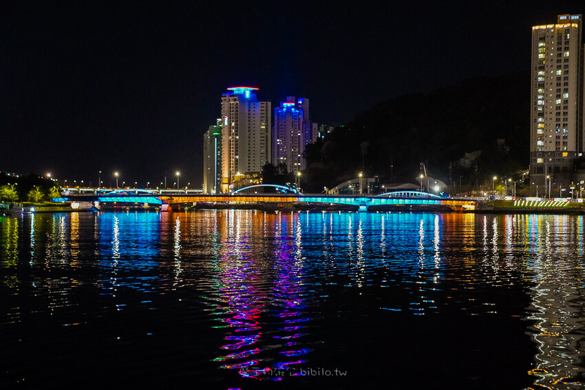 當天夜色極好,且我原本以為我會暈船『要暈我也是要暈在朴敘俊身上啊』,但遊艇很穩且河面也沒什麼浪,所以整體搭下來是很不錯的,而航行路線會從水螢橋渡船口-民樂橋-廣安大橋,中間也會經過沿岸知名的景點,比較特別的是,經過民樂橋時,因為橋墩較矮,所以航行人員會請位在二樓的遊客盡可能壓低身體讓船通過,也比較安全,記得要壓低身體喔,因為真的會撞到,很危險的。