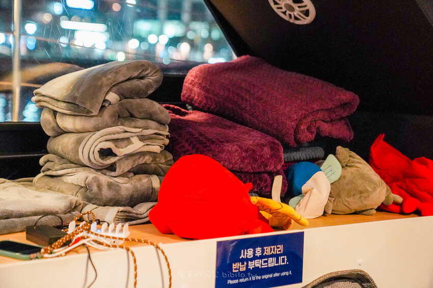 船艙裡有附上毛毯跟一些造型頭套另外還有點心飲料自取,室內有暖氣,但戶外甲板區域是很冷的風也比較大,尤其入夜後的釜山,更冷,建議大家可以裹上毛毯保暖。