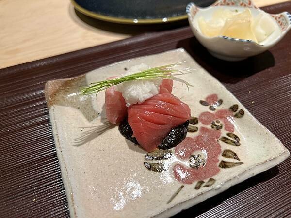 第五道:黑鮪魚赤身 大腹 海苔醬 芽蔥 山藥泥