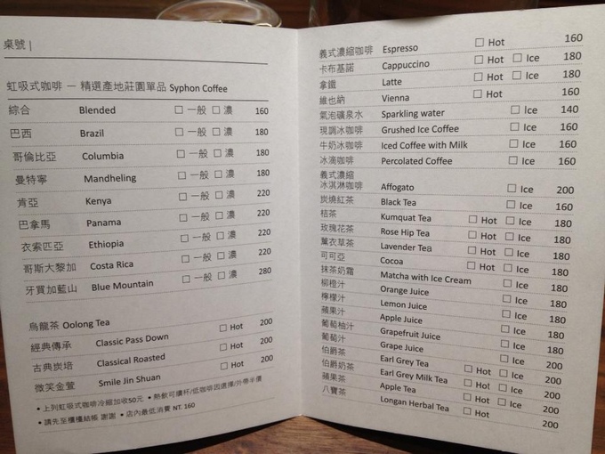 下面菜單小字是寫:上列虹吸式咖啡冷縮加收50元