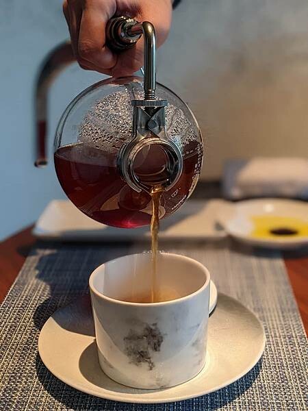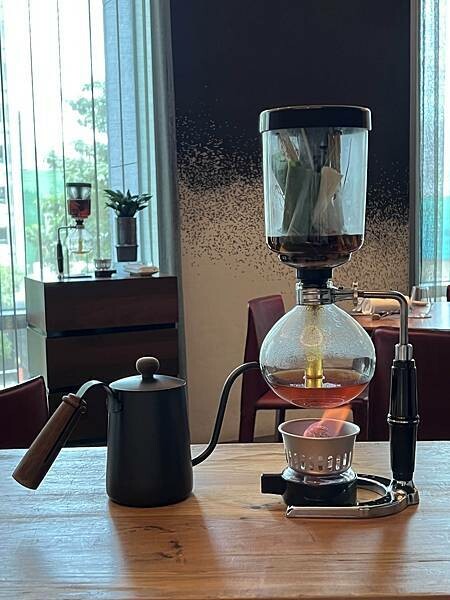以咖啡店才會有的虹吸壺呈現人蔘雞湯,