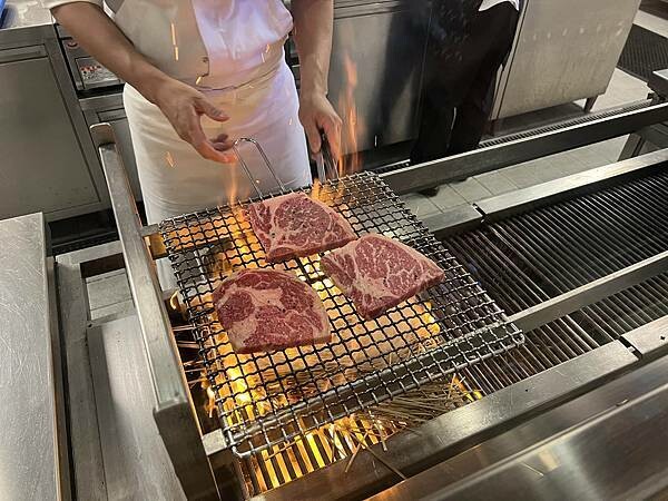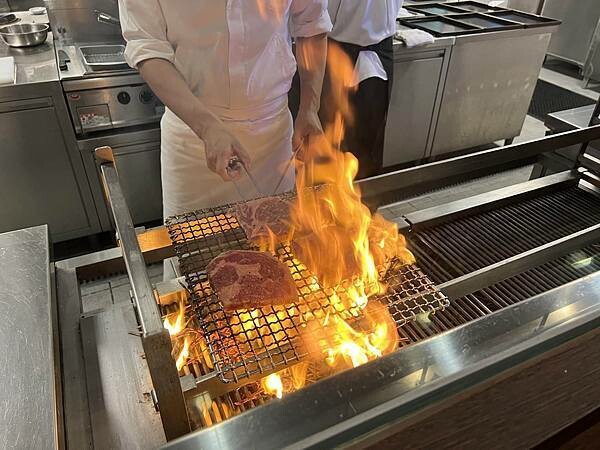 當海鱺烤好之後,接著主廚就處理午間套餐中的沙朗牛。