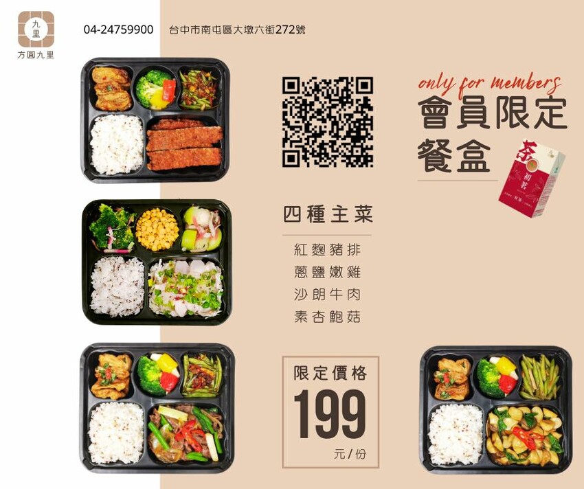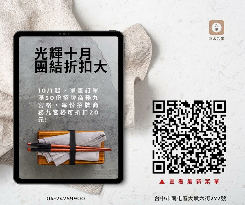 還沒成為會員也沒關係,只要揪團訂餐折扣一樣有,10/1起單筆訂餐滿30份招牌商務九宮格每份餐盒立即折扣20元。(點連結查看方圓九里最新NENU)