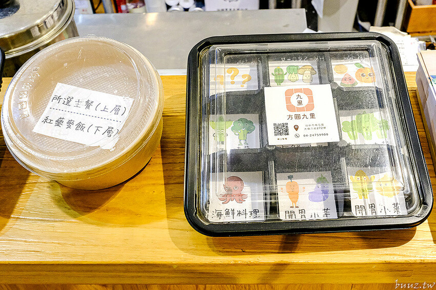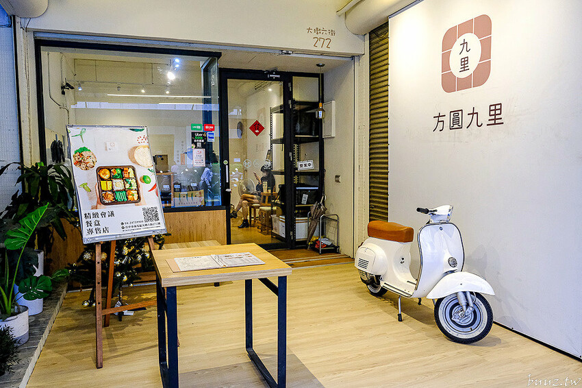 門口有擺放會議餐盒的主菜及相關菜色搭配的介紹,「方圓九里」九宮格餐盒現階段已經沒有提供內用,完全改成外帶、預訂為主,櫃台處也有把餐盒的價位種類陳列出來,方便讓客人了解訂購。