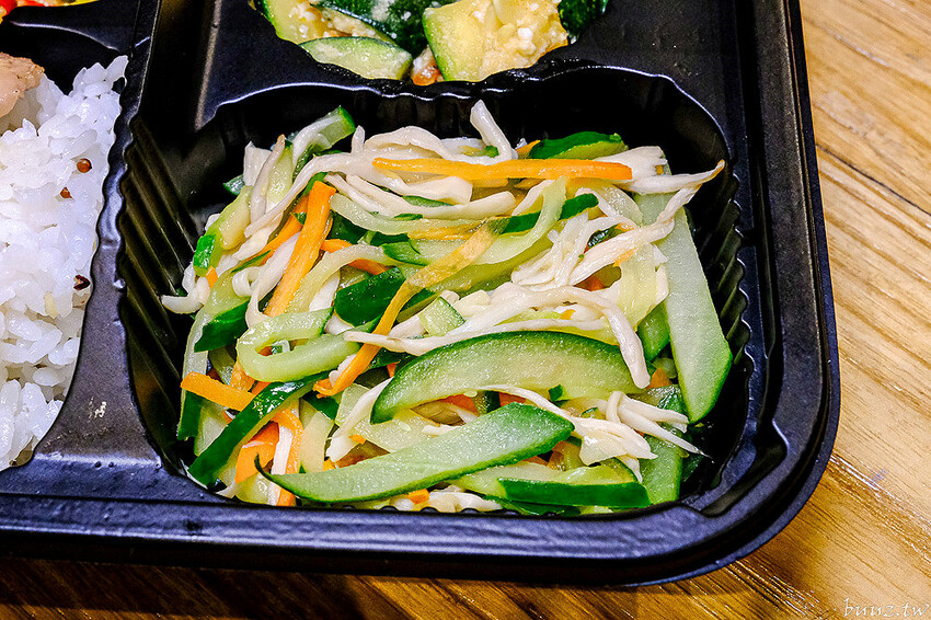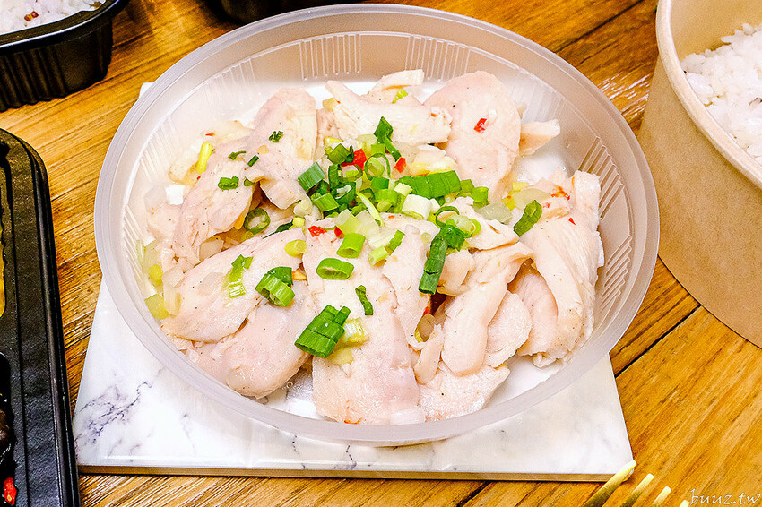九宮格的主菜跟米飯分成上下層飯盒裝著,主菜蔥鹽香嫩雞也是新菜色,以低溫舒肥的雞胸肉去切片後再搭配自製的蔥鹽醬。