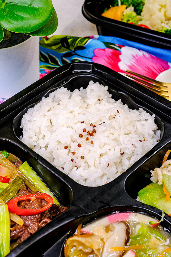米飯是選用台灣蓬萊並且加入了紅藜麥,紅藜麥中的蛋白質、膳食纖維與胺基酸都很豐富,增添整體的營養價值。