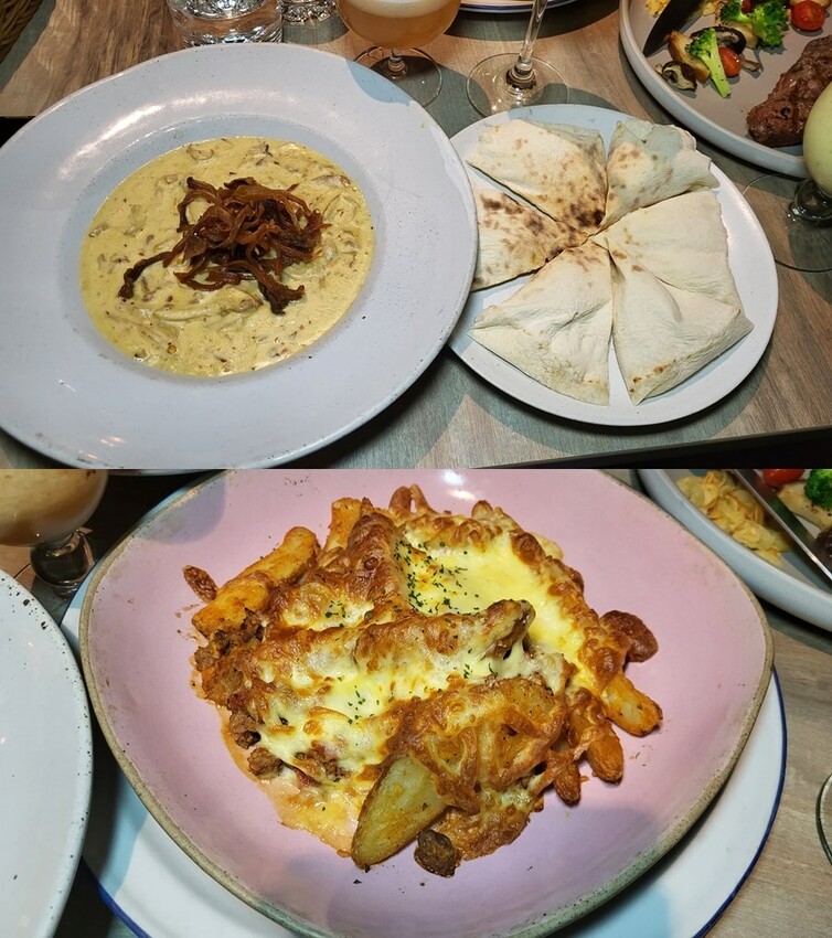 (上圖)奶油白酒綜合菇佐披薩球$240,(下圖)肉醬薯條$220。