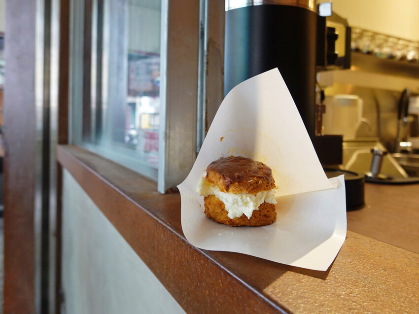 外帶時,店員會問是否現吃,如果是的話,店家會直接加熱並夾入鮮奶油。店員拿給我時,真的有種我愛店「悄悄好食」司康的既視感,無論外觀、夾層、口味、包裝,皆十分神似。
