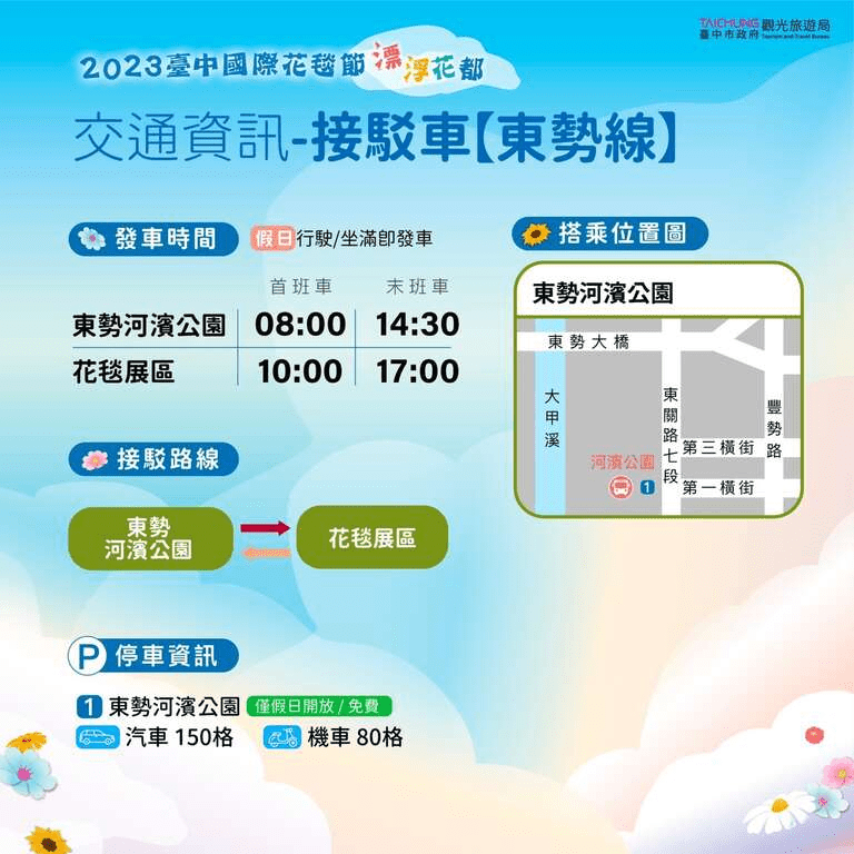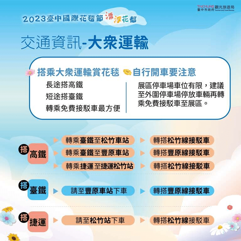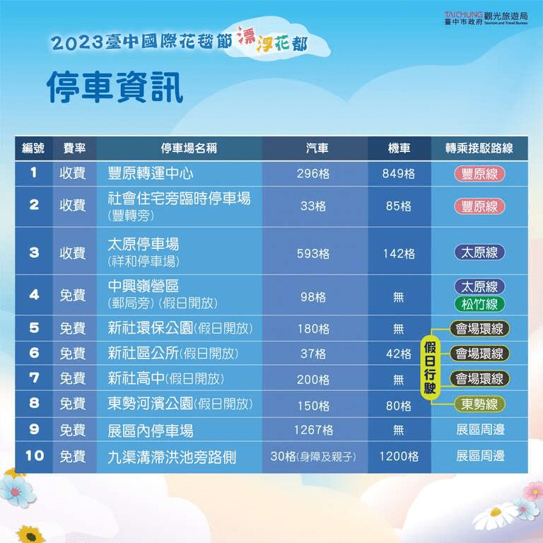 豐原線、太原線、松竹線、東勢線及會場環線(展區巡迴路線)5條免費接駁路線,平假日皆有接駁車提供服務,前往花海會場服務時間自上午8時至下午2時30分;參觀完花海後,回程的接駁車服務時間自上午10時至下午5時,其中東勢線及會場環線為假日特別加開的接駁線!