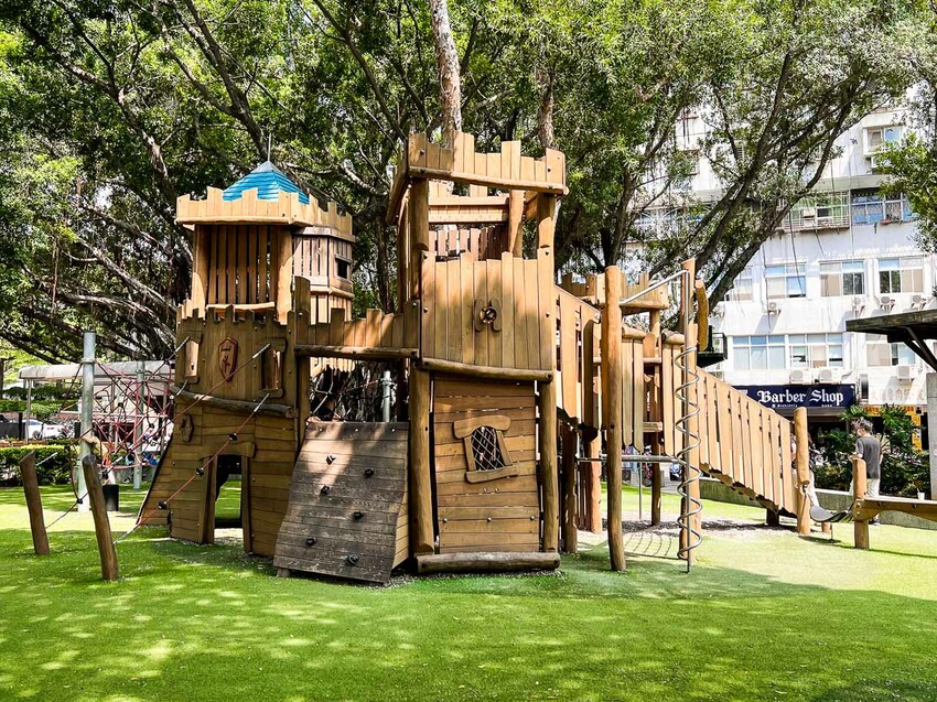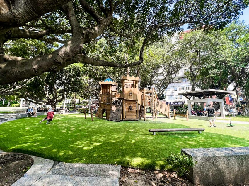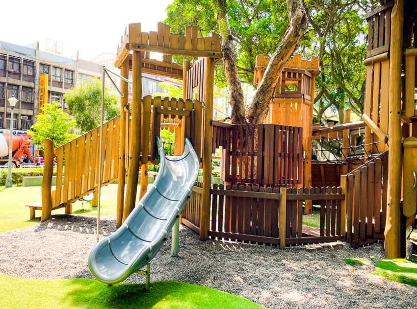 公園裡還有原木搭建的森林溜滑梯,樹屋造型很可愛,可以讓小朋友排上爬下溜滑梯,而且還有綠樹遮蔽,夏天來玩也不會很熱