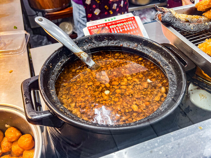 滷汁也可以免費加,愛吃爌肉的朋友看到這鍋應該會很開心,三層肉一整個就是醬香濃郁的樣子!
