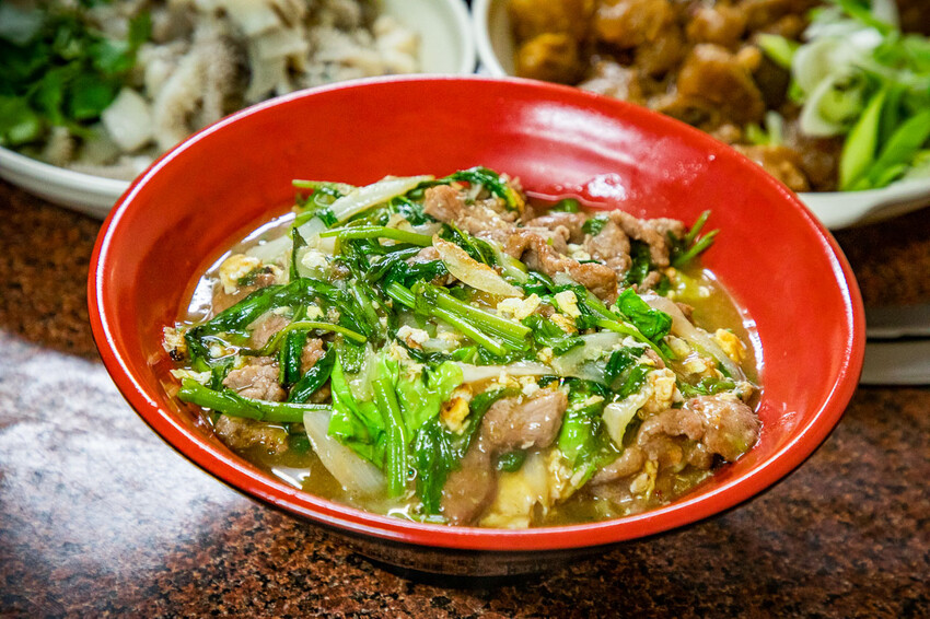 牛肉燴飯,這道也是人氣很高的主食,白飯淋上滿滿蔬菜炒牛肉,伴隨著洋蔥甜、空心菜與蛋汁,牛肉片不乾不柴,就是經典台式燴飯口味,大量燴飯湯汁滲入白飯中,濕潤又夠味,然後份量真的很大,一個大男生一定吃得飽