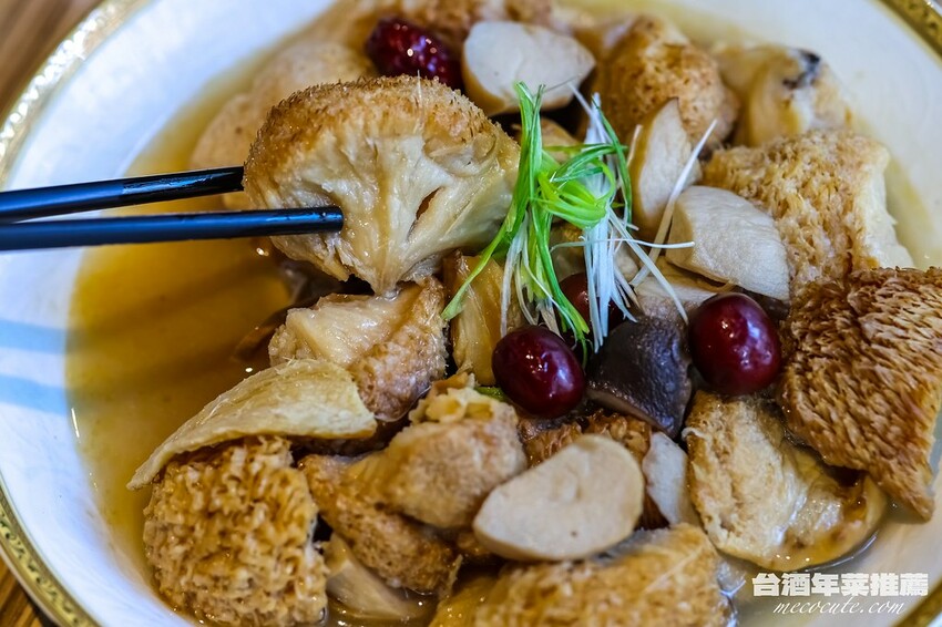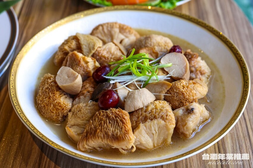 看名稱就覺得很補的「台酒酒香麻油猴頭菇」,以麻油、薑片、當歸、川芎等中藥熬製而成湯頭,並加入台酒的雙鹿五加皮酒,獨特的香氣跟口感,在天氣寒冷的時候品嚐,讓身體都暖了,很適合過年的一道菜。