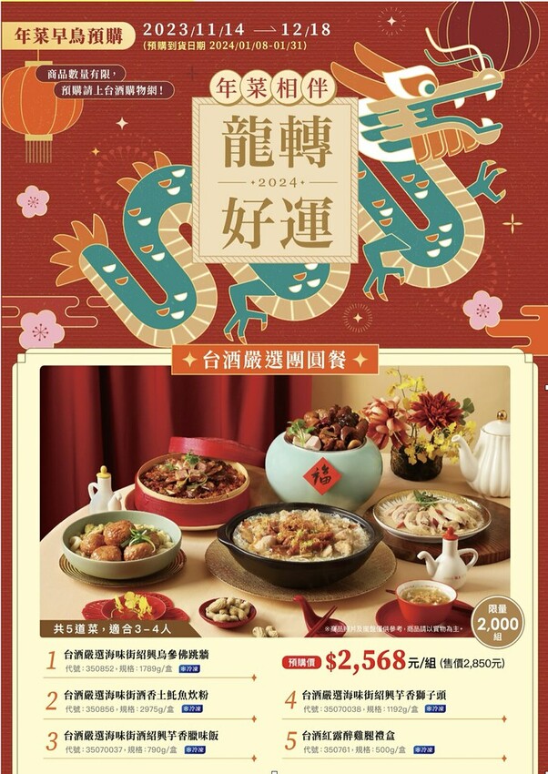 台酒嚴選團圓餐共5道菜,適合3-4人,年菜早鳥預購價2568元,限量2000組