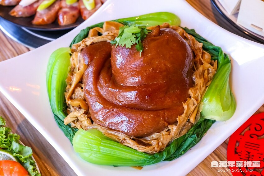 以肉質滑嫩的蹄膀為特色,巧妙地加入了數種香料讓蹄膀入味上色,再以紹興酒提香增加蹄膀的香氣,加熱後搭配特製的醬汁,蹄膀的肉質軟嫩入味,並發出淡雅的酒香,味道極佳。