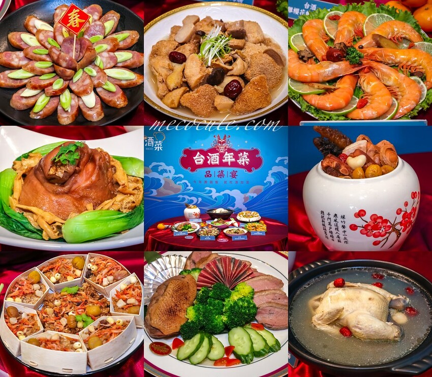 今年台酒推出的年菜預購有台酒琴酒香腸、台酒花雕珍饌醉蝦、台酒花雕櫻花蝦珠貝米糕、台酒嚴選海味街富貴極品佛跳牆、台酒白蘭地櫻桃鴨胸、台酒酒香麻油猴頭菇、台酒酒馥花雕瑤柱雞湯等八道以酒入菜的年菜料理。