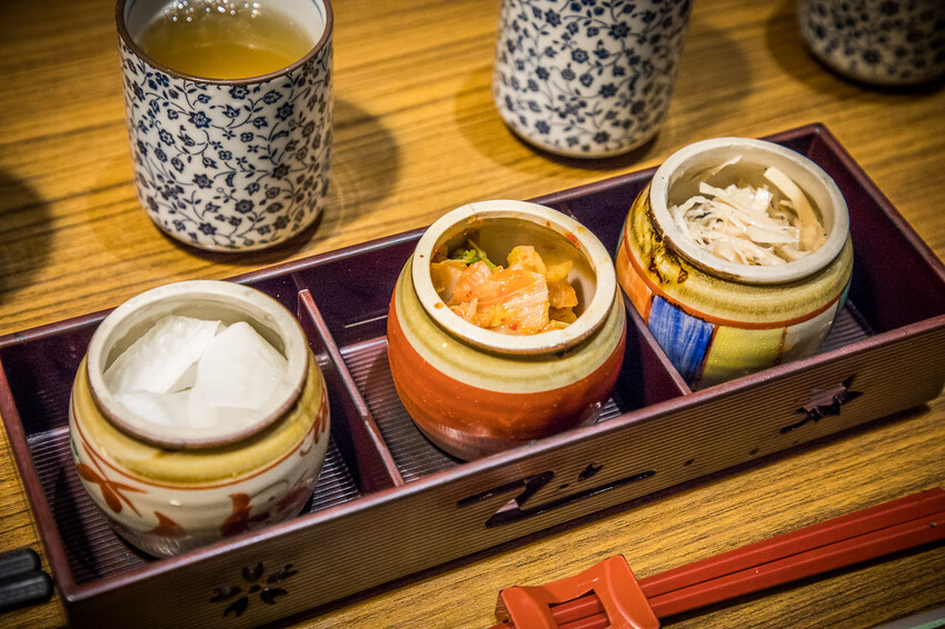 坐下來服務生就會來倒茶跟送上小菜,小菜有三種柚子大根、飲ㄌㄧㄠ泡菜、牛蒡絲,給你開胃用的,不能續